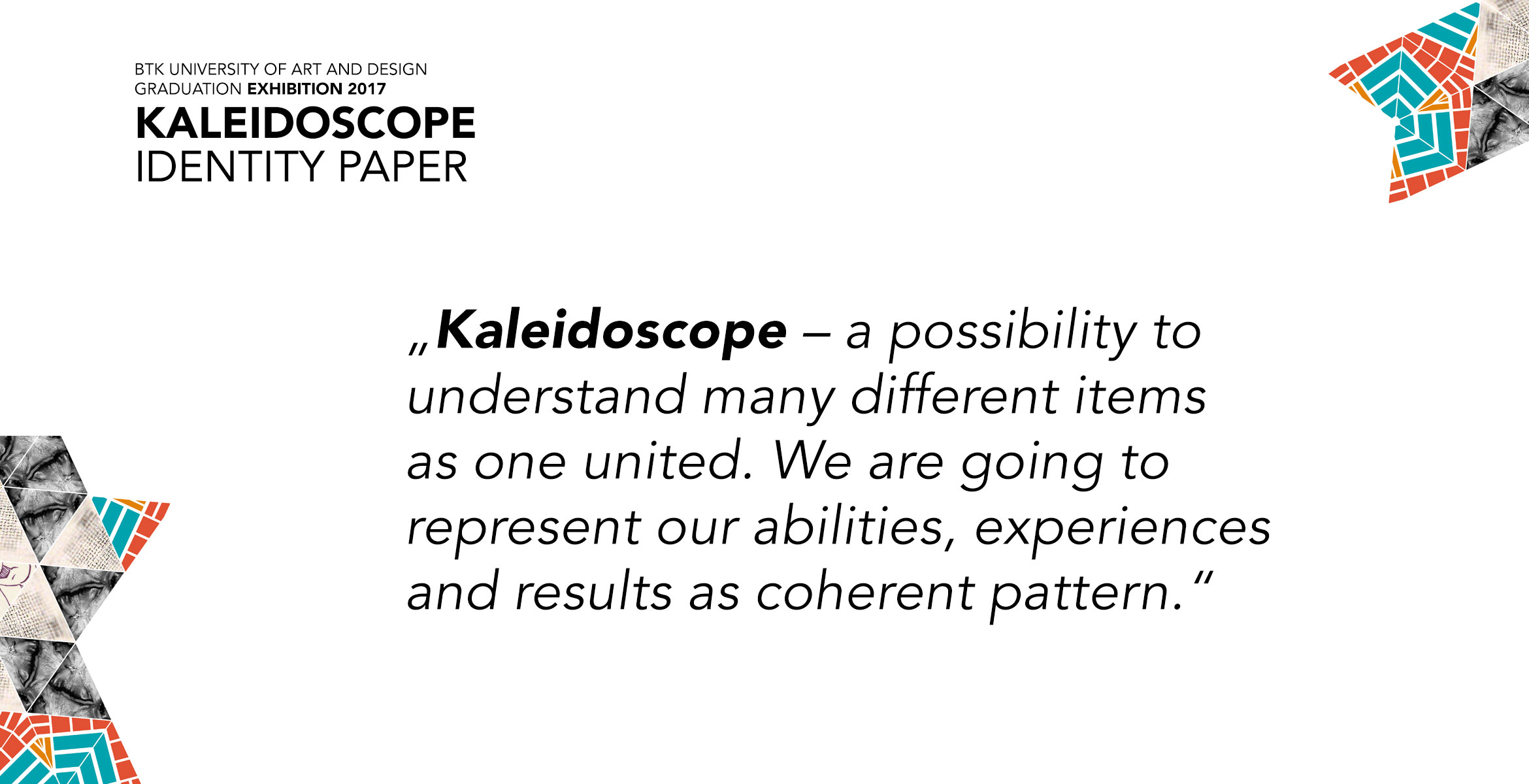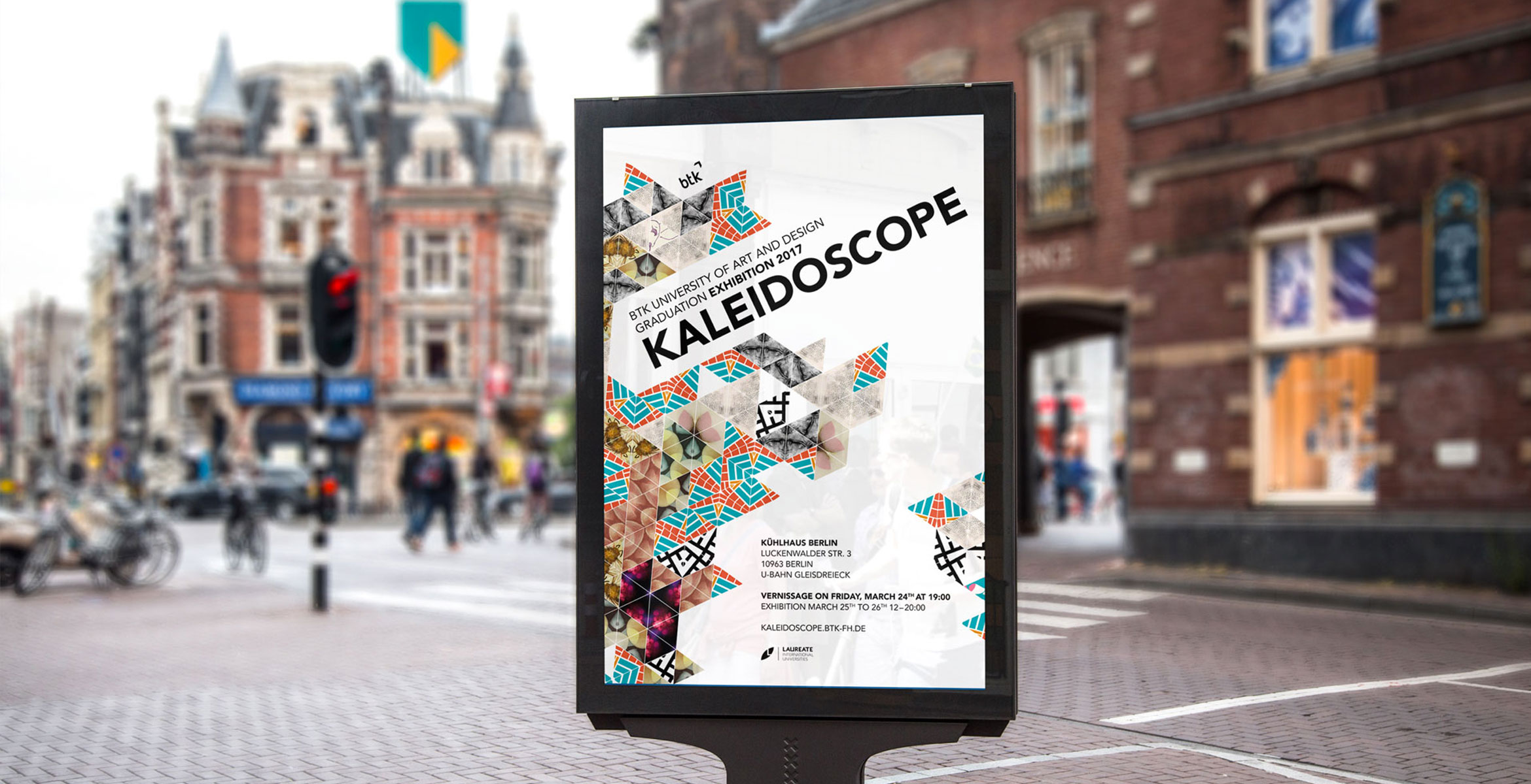 Kaleidoscope was the name and theme of our bachelor graduation exhibition in Berlin. More then 80 students completed their Bachelor of Arts in March 2017. In a democratic process we discussed several themes and names for our exhibition and created an identity group, responsible for the design and strategy process.